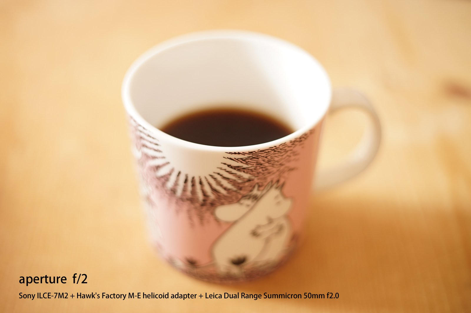 写真は昔フィンランドのArabia(iittala傘下)という陶器のメーカーへ工場見学に行ったときに貰ったコーヒーカップです。最短撮影距離が50cmのDRズミクロンとヘリコイド付きのマウントアダプタを目一杯伸ばすと(最短撮影側)、レンズの先からピントの合う点まで23cmくらいでかなり寄れます。倍率の計算はめんどくさいのでよくわかりませんがとにかく結構寄れます。今回はその最短撮影距離にピントをあわせた状態でのボケの比較です。だから何?って感じですが。